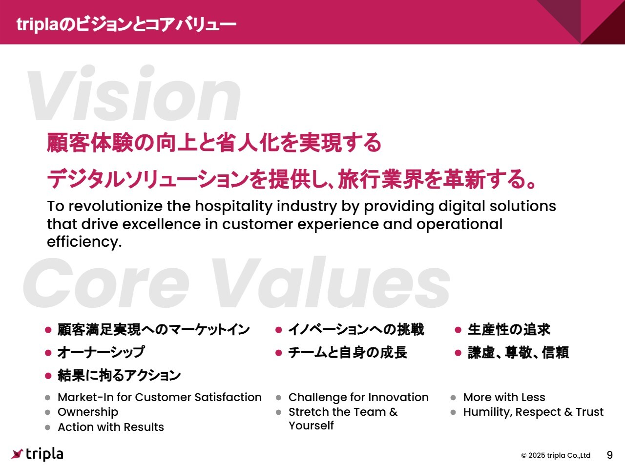 ビジョンは「顧客体験の向上と省人化を実現するデジタルソリューションを提供し、旅行業界を革新する」です。