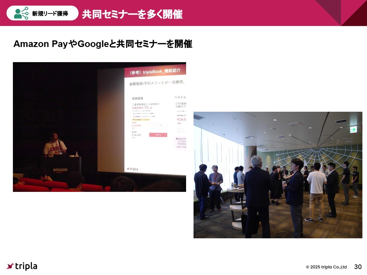 パートナー企業と共同でセミナーを実施しています。今年は「Amazon Pay」との連携が完了したことから、Amazonの事務所内で共同セミナーを開催したり、「GHA(Googleホテル広告)」との連携を強化したことにより、Googleとの共同セミナーを開催したりしています。