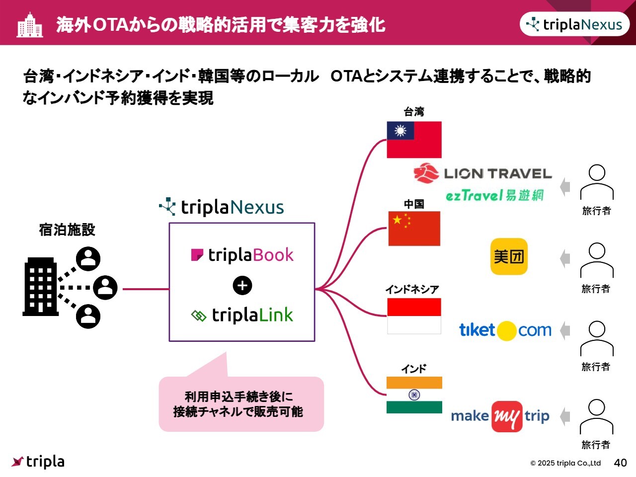 集客力の強化についてです。現在、「tripla Nexus」というサービスを海外を中心に準備を進め、販売の拡大を目指しています。具体的には、台湾のLION TRAVEL、中国の美団、インドネシアのtiket.com、インドのMake My Tripといった各国で強みを持つOTAと連携しています。