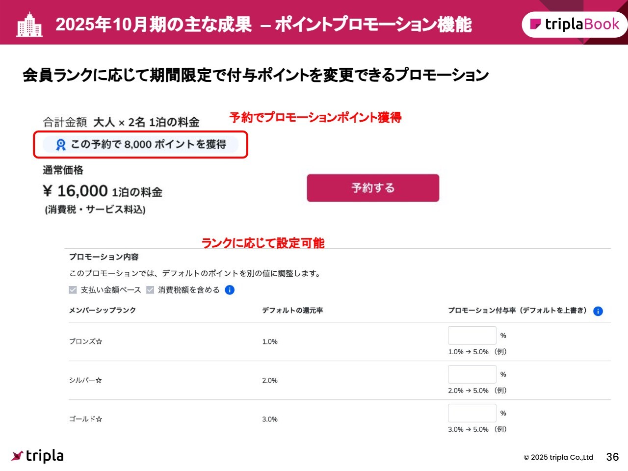 この1年間でどのような機能が追加されたのかという点ですが、「tripla Book」については、ポイントプロモーション機能が追加されました。これは、特定の予約をすると一定のポイントがもらえるようなキャンペーンに連動したプロモーションを実施できる機能です。