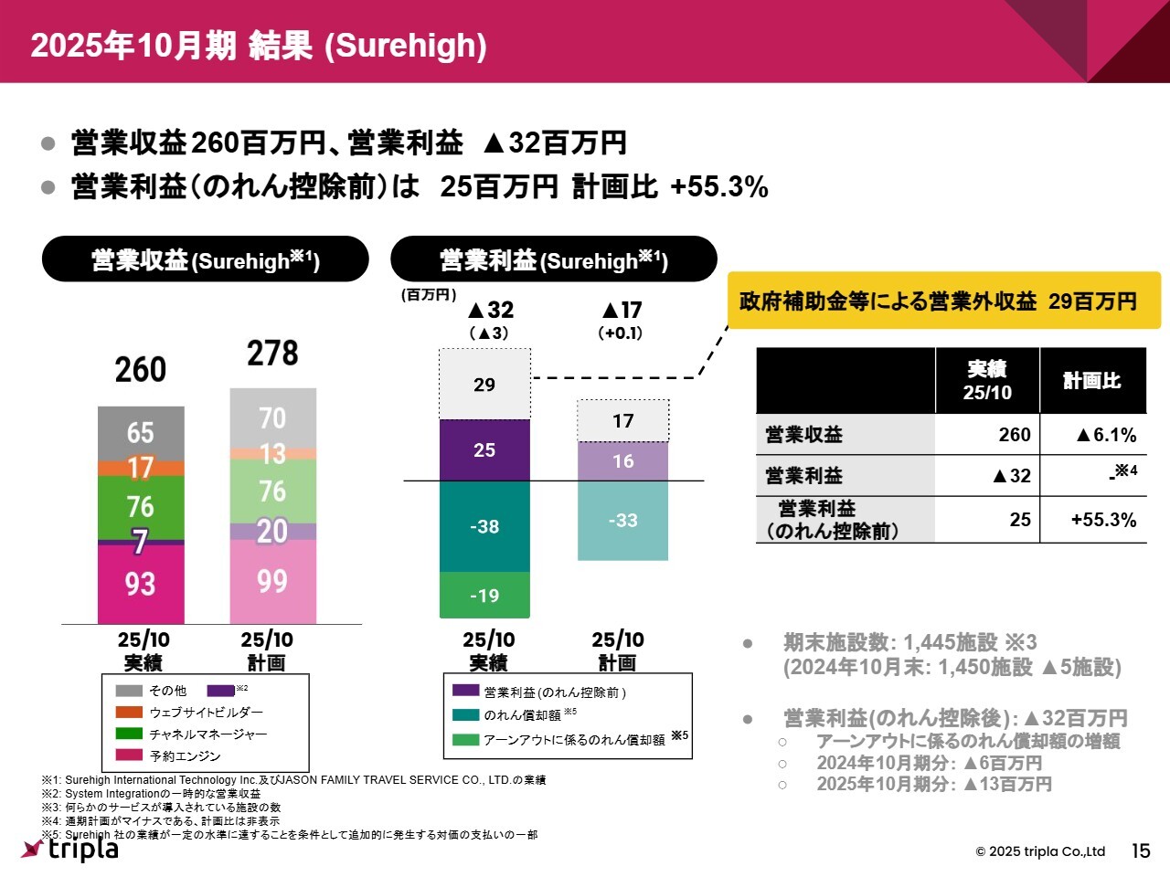 Surehigh社は、営業収益2億6,000万円で、計画の2億7,800万円と比較すると1,800万円のマイナスとなりました。営業利益は当初マイナス1,700万円を見込んでいましたが、最終的にマイナス3,200万円で着地しています。