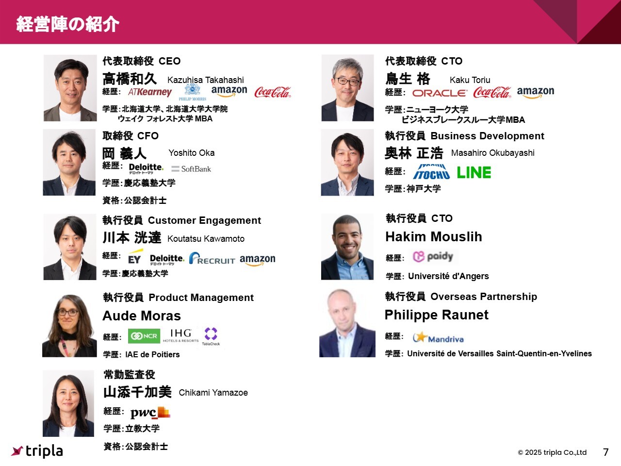 経営陣についてですが、前回から大きな変更はありません。ただし、前期2025年10月期に執行役員CTOとしてHakim氏、執行役員Product ManagementとしてAude氏の2名が加わっています。
