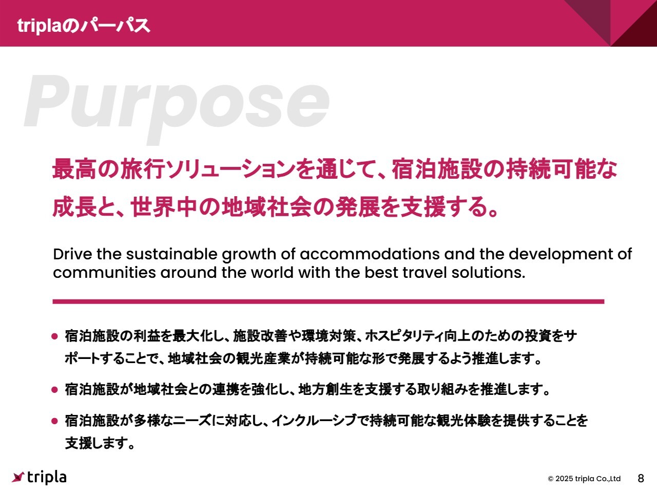 triplaは「最高の旅行ソリューションを通じて、宿泊施設の持続可能な成長と、世界中の地域社会の発展を支援する」をパーパスとして掲げています。