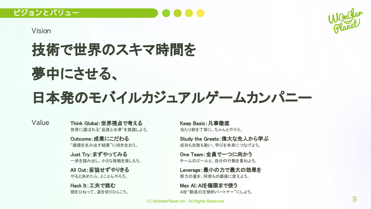 今年度新たに策定した当社のビジョン・バリューについてです。ビジョンは「技術で世界のスキマ時間を夢中にさせる、日本発のモバイルカジュアルゲームカンパニー」であり、バリューは10項目で構成されています。