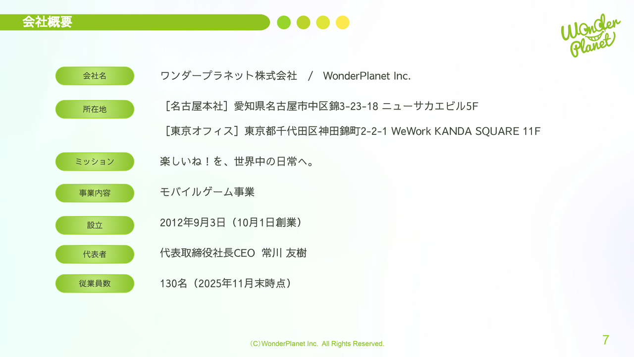 コーポレートサマリーです。名古屋を本社とし、東京にもオフィスを構えています。事業内容はモバイルゲーム事業で、従業員数は2025年11月末時点で130名です。