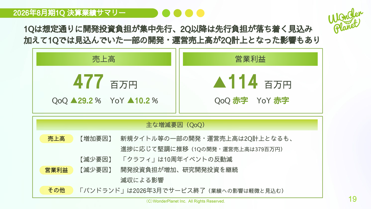 また、第1四半期に見込んでいた一部の開発・運営売上高が第2四半期へスライドした影響で、売上高・営業利益ともに数千万円規模の影響を受けました。その結果、売上高は4億7,700万円となり、営業利益は1億1,400万円の赤字となりました。