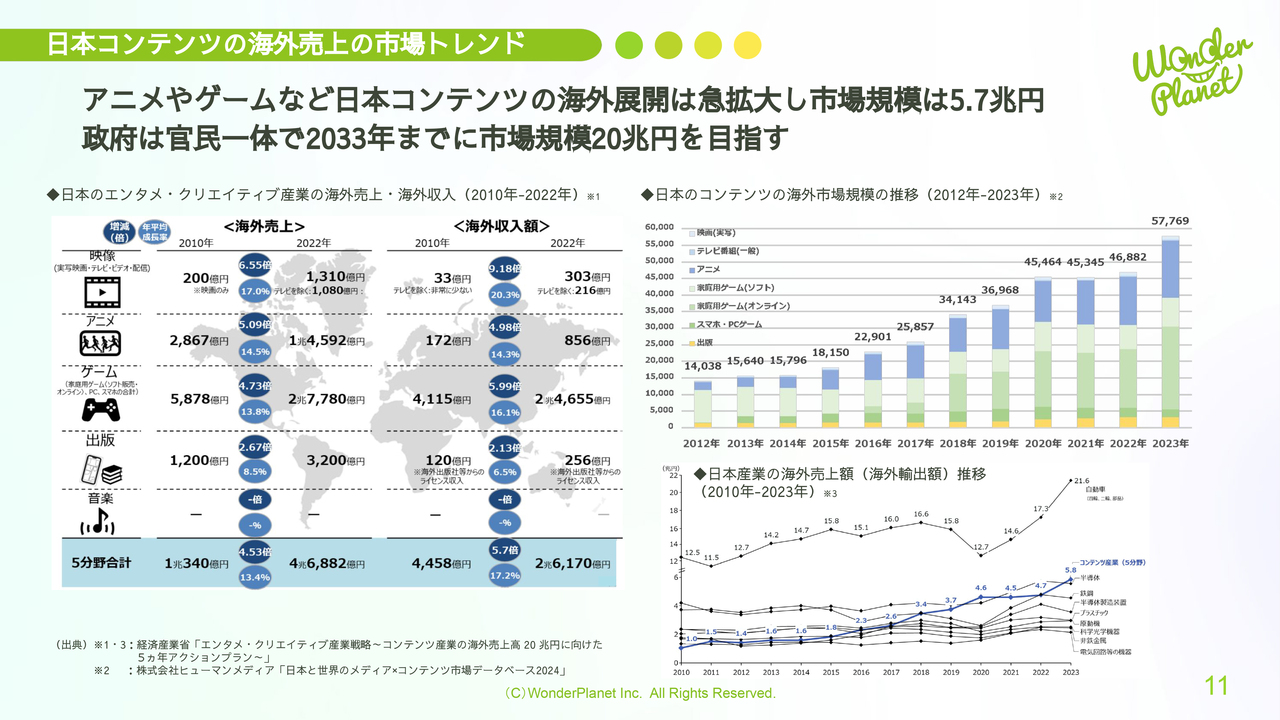 また、日本政府は官民一体となり、日本のコンテンツ産業の市場規模を2033年までに20兆円に拡大することを目標としています。