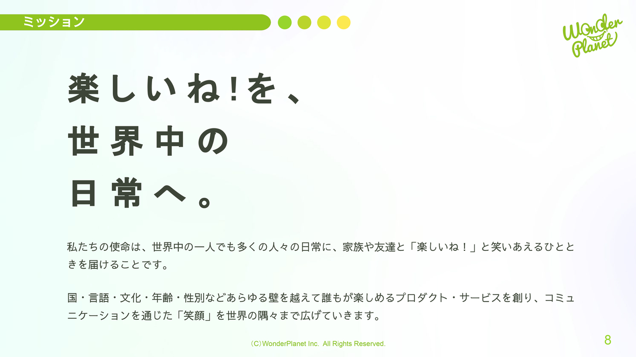 当社のミッションは「楽しいね!を、世界中の日常へ。」です。この短い文章には大きく4つの意味が含まれ、その1つが「楽しい」、すなわちゲーム・エンターテインメントです。