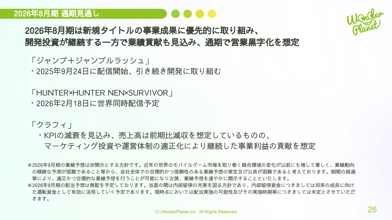2026年8月期の通期見通しについてです。2026年8月期は新規タイトルの事業成果に優先的に取り組み、開発投資を継続しつつ、業績への貢献を見込み、通期での営業黒字化を想定しています。