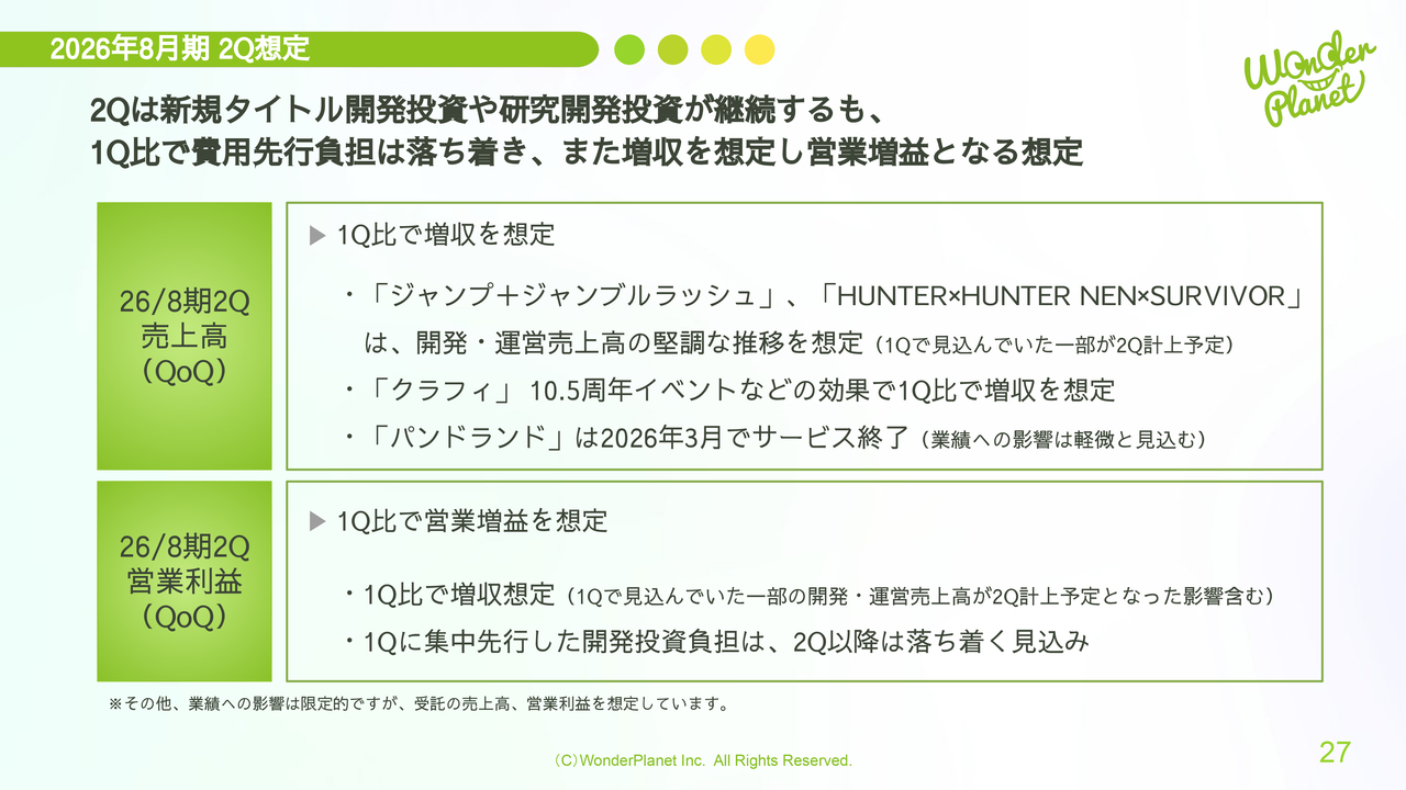 売上高について、「ジャンプ+ジャンブルラッシュ」、「HUNTER×HUNTER NEN×SURVIVOR」は、開発・運営売上高の堅調な推移を見込んでいます。「クラフィ」は10.5周年イベントなどの効果により、第1四半期比で増収を想定しています。なお、「パンドランド」は3月にサービス終了予定ですが、業績への影響は軽微と見込んでいます。
