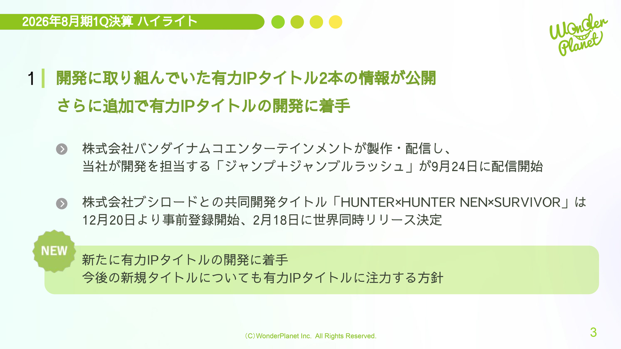新たな情報として、有力IPタイトルの開発に新たに着手しました。今後も新規タイトルにおいて、有力IPタイトルに注力する方針です。