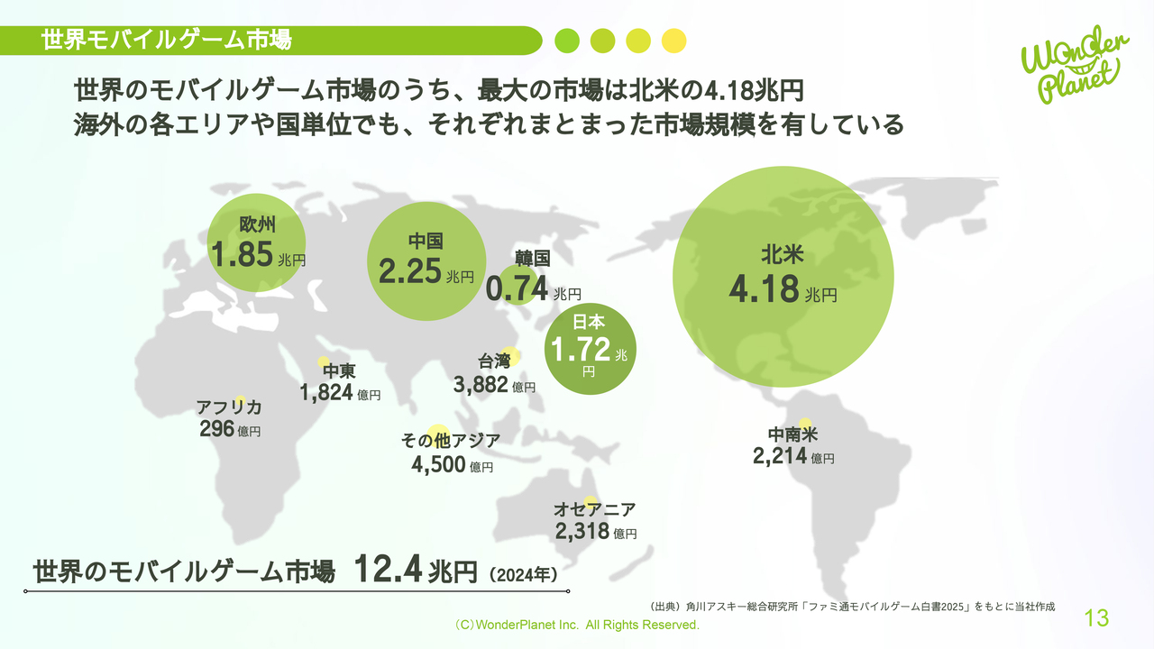 世界モバイルゲーム市場についてです。当社のモバイルゲーム市場において最大の市場は北米で、その規模は4兆1,800億円です。一方、海外の各エリアや国単位でもそれぞれにまとまった市場規模が存在し、当社はこれらのエリアや国単位でのシェア拡大を目指していきます。
