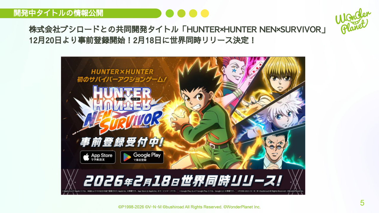 あらためて、開発中タイトルの情報公開についてです。株式会社ブシロードとの共同開発タイトル「HUNTER×HUNTER NEN×SURVIVOR」は、12月20日より事前登録を開始し、2月18日に世界同時リリースを予定しています。現在、リリースに向けて鋭意準備を進めています。もうしばらくお待ちいただけると幸いです。