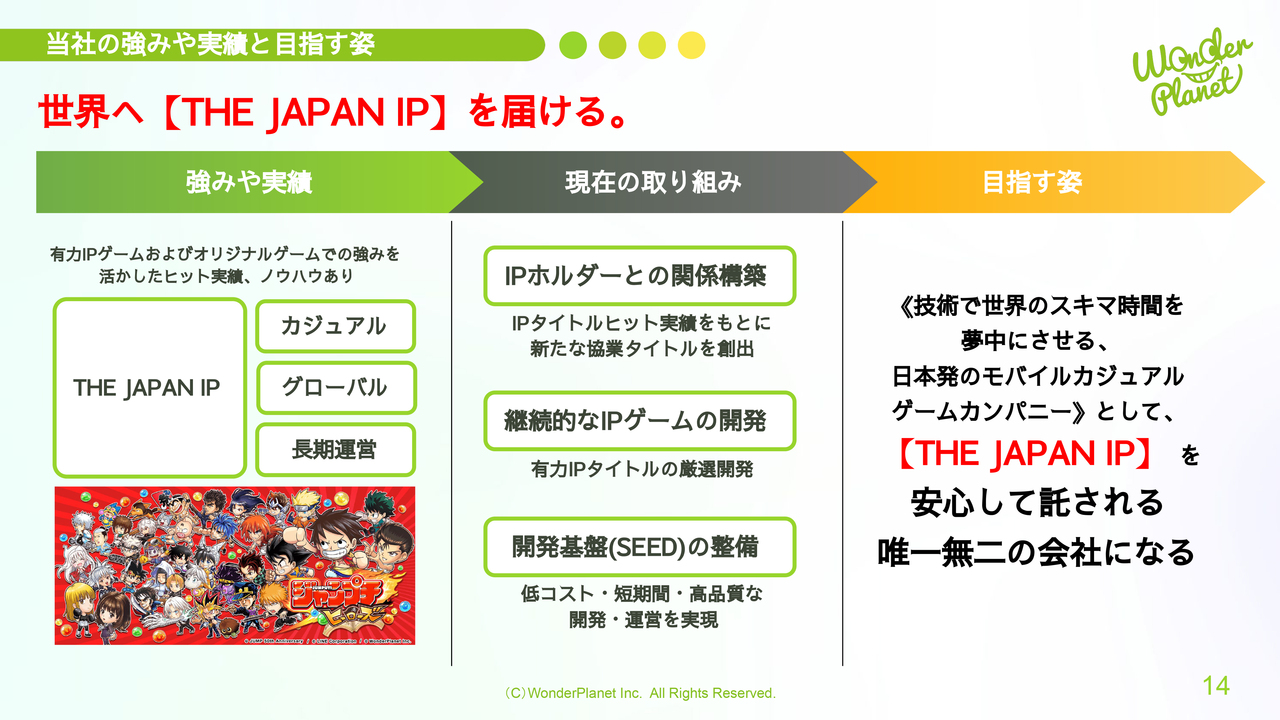 当社の強みや実績、そして目指す姿についてです。「世界へ【THE JAPAN IP】を届ける。」に向けて、これまでの有力IPゲームやオリジナルゲームで培った強みを活かし、ヒット実績、カジュアル・グローバル・長期運営のノウハウを有している点を当社の強みとし、「日本を代表するIPを安心して託していただける会社」と、あらためて自覚しています。