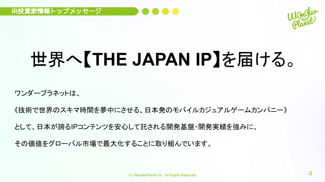 「世界へ【THE JAPAN IP】を届ける。ワンダープラネットは、《技術で世界のスキマ時間を夢中にさせる、日本発のモバイルカジュアルゲームカンパニー》として、日本が誇るIPコンテンツを安心して託される開発基盤・開発実績を強みに、その価値をグローバル市場で最大化することに取り組んでいます」