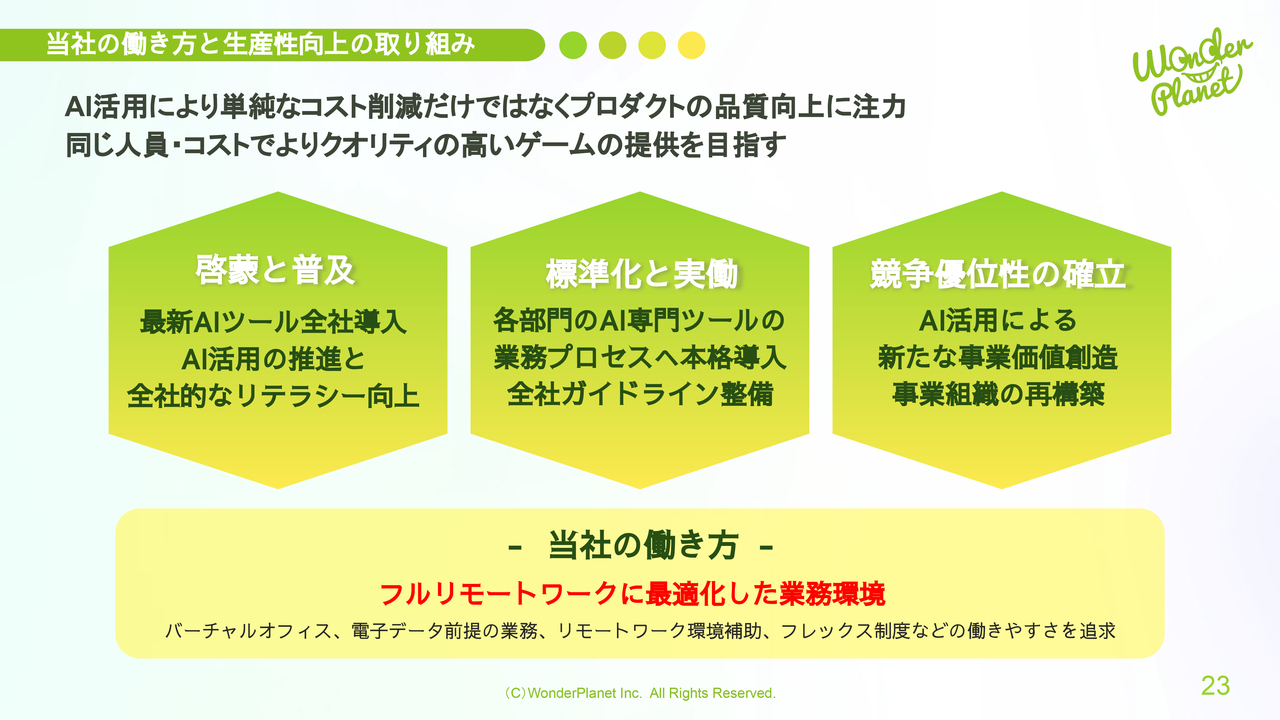 当社はAIの活用を通じて、単なるコスト削減にとどまらず、プロダクトの品質向上に注力し、同じ人員とコストでより高品質なゲームの提供を目指しています。