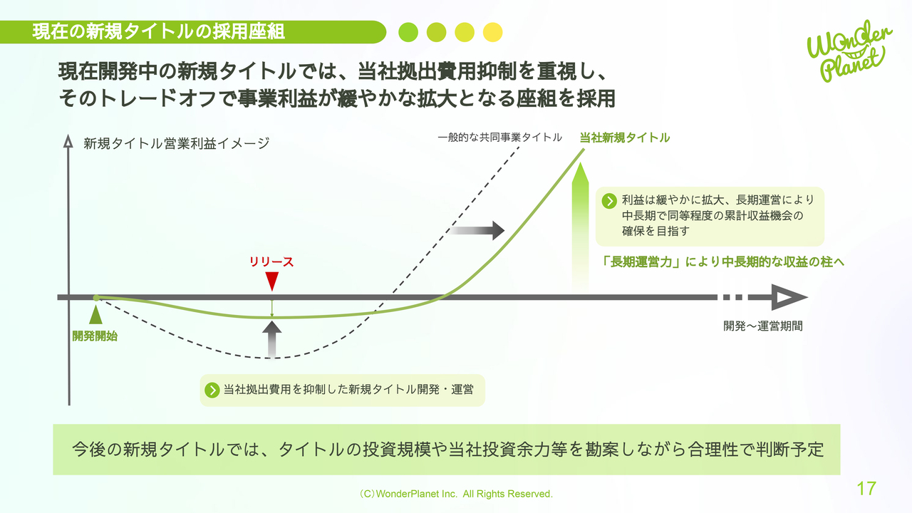 現在の新規タイトルで採用している座組について説明します。現在開発中の新規タイトルでは、当社の拠出費用抑制を重視し、そのトレードオフとして事業利益が緩やかに拡大する座組を採用しています。