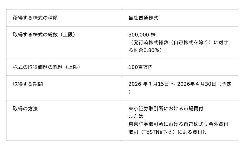 当社は、資本効率の向上および株主の皆様への利益還元を図るとともに、経営環境の変化に対応した機動的かつ柔軟な資本政策の実施を可能とすることを目的に、自己株式の取得を行います。