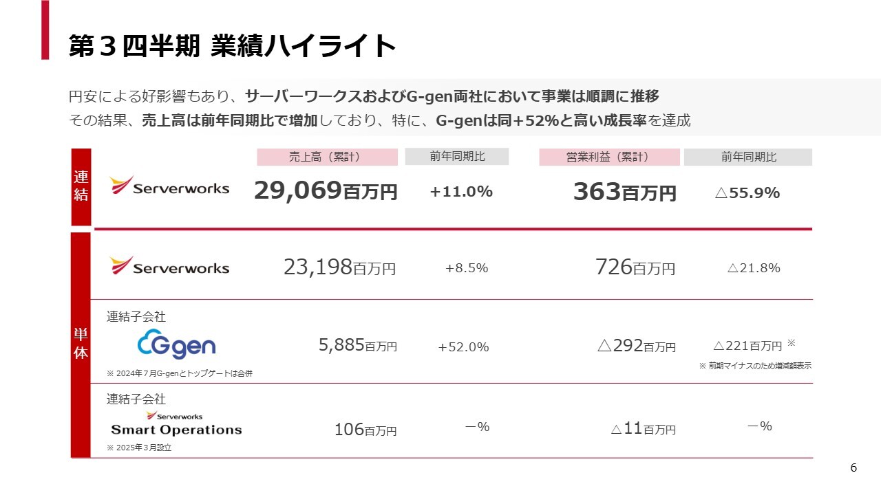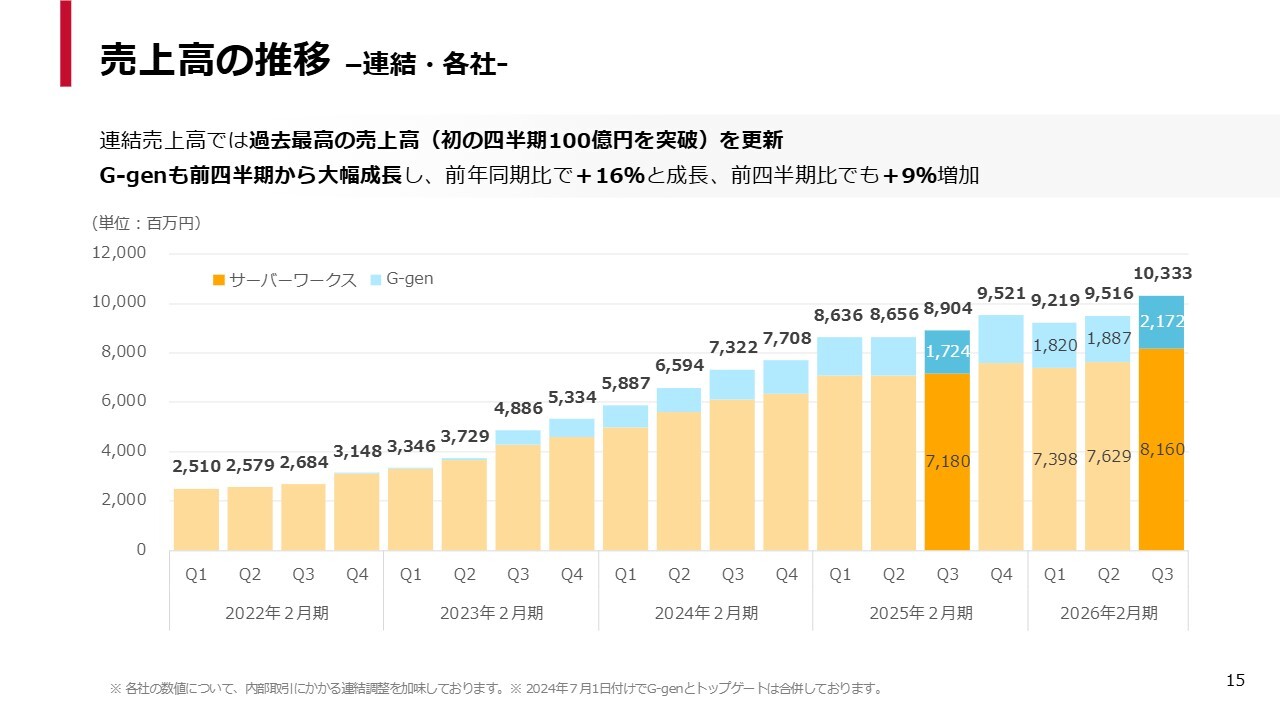 スライドのグラフのとおり、四半期ベースで非常に順調に伸びており、この第3四半期では初めてグループ全体で100億円の大台を突破しました。G-genも前四半期から大幅に成長し、前年同期比で16パーセント増となっています。