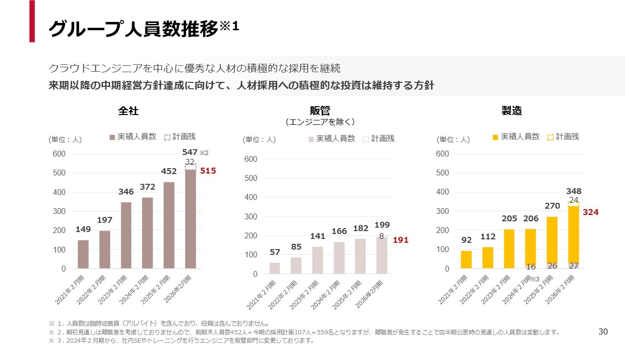 グループの規模も順調に拡大を続けており、本日時点でグループは515名の体制です。年末には547名を計画しており、順調に推移しています。