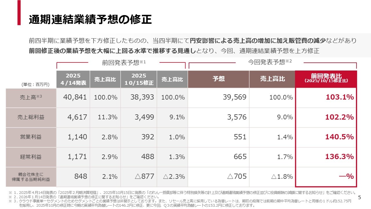 スライドのとおり、通期連結業績予想を修正しました。前回の四半期には、「2025/10/15修正」の欄に記載のとおり連結の業績予想を下方修正しました。今回の発表では、「予想」の欄に記載のとおり、上方修正しています。