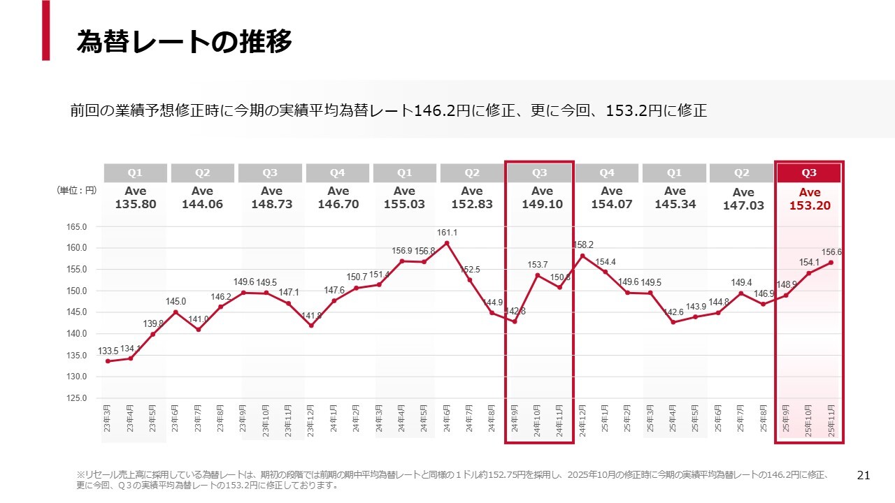 スライドのチャートは、第3四半期の為替レートを示しています。第2四半期は円高に振れていたため、下方修正と判断しました。しかしその後、急激な円安を受け、今回上方修正を行いました。