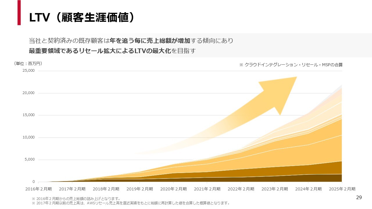 当社は2008年からAWSのセールスを開始していますが、その時期から当社をご利用いただいているお客さまが、当社に対する支払いを徐々に増やしてくださいました。その結果、非常に大きな地層のようなかたちで売上が積み重なってきています。