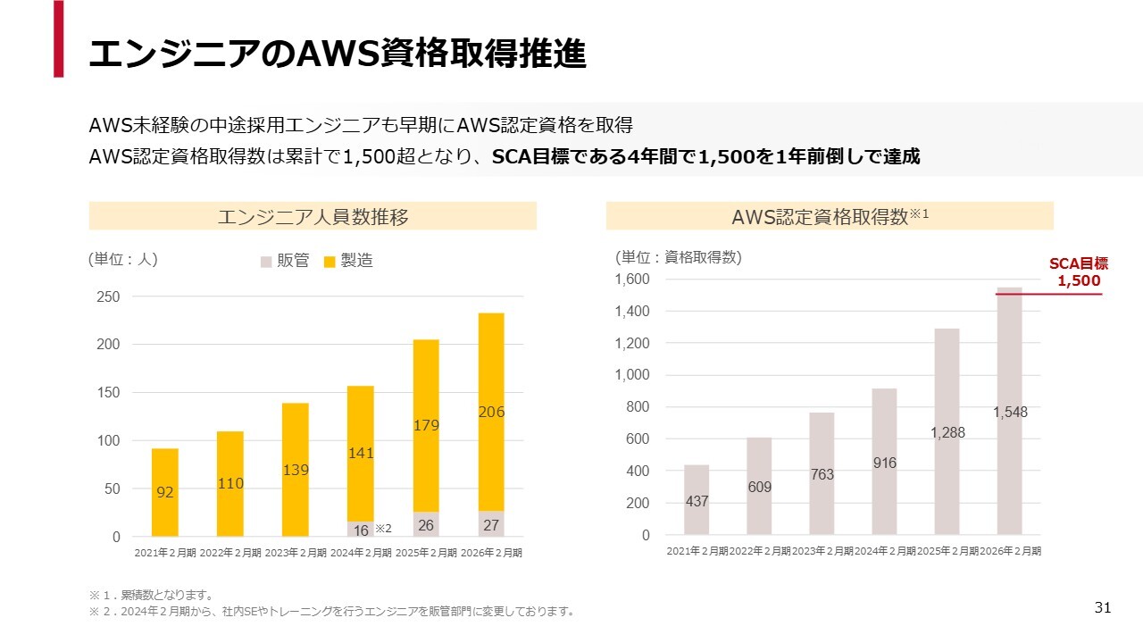 もともとスキルを持ったエンジニアが当社に入社し、さらに当社内でスキルを磨いてAWSの資格を取得するという好循環が生まれた結果、この1,500件という数値目標を前倒しで達成することができました。