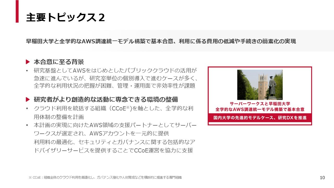 2つ目に、早稲田大学さまと全学的なAWS調達統一モデル構築で基本合意しました。これまで早稲田大学さまでは、各研究室単位でさまざまなパブリッククラウドの導入が個別に行われていました。
