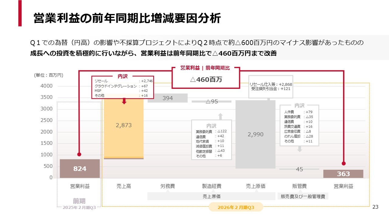 1つ目は、業績予想修正の要因についてです。前四半期においてクラウドインテグレーション事業の不採算プロジェクトの影響により、残念ながら業績予想を下方修正しました。