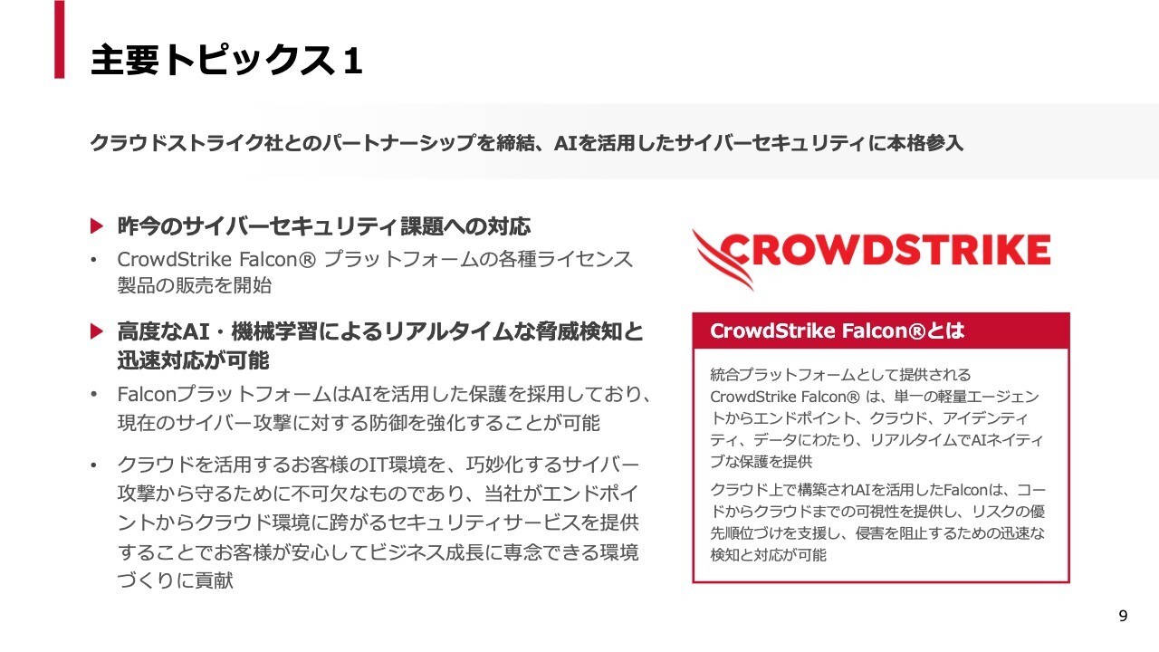 当社は、クラウドのインフラストラクチャーの提供に加え、クラウドセキュリティや生成AIのワークロードも統合していくという事業方針を掲げています。特にセキュリティ強化の中で、クラウドストライク社さまとのパートナーシップが中核を担うと考えており、当社にとって非常に期待しています。