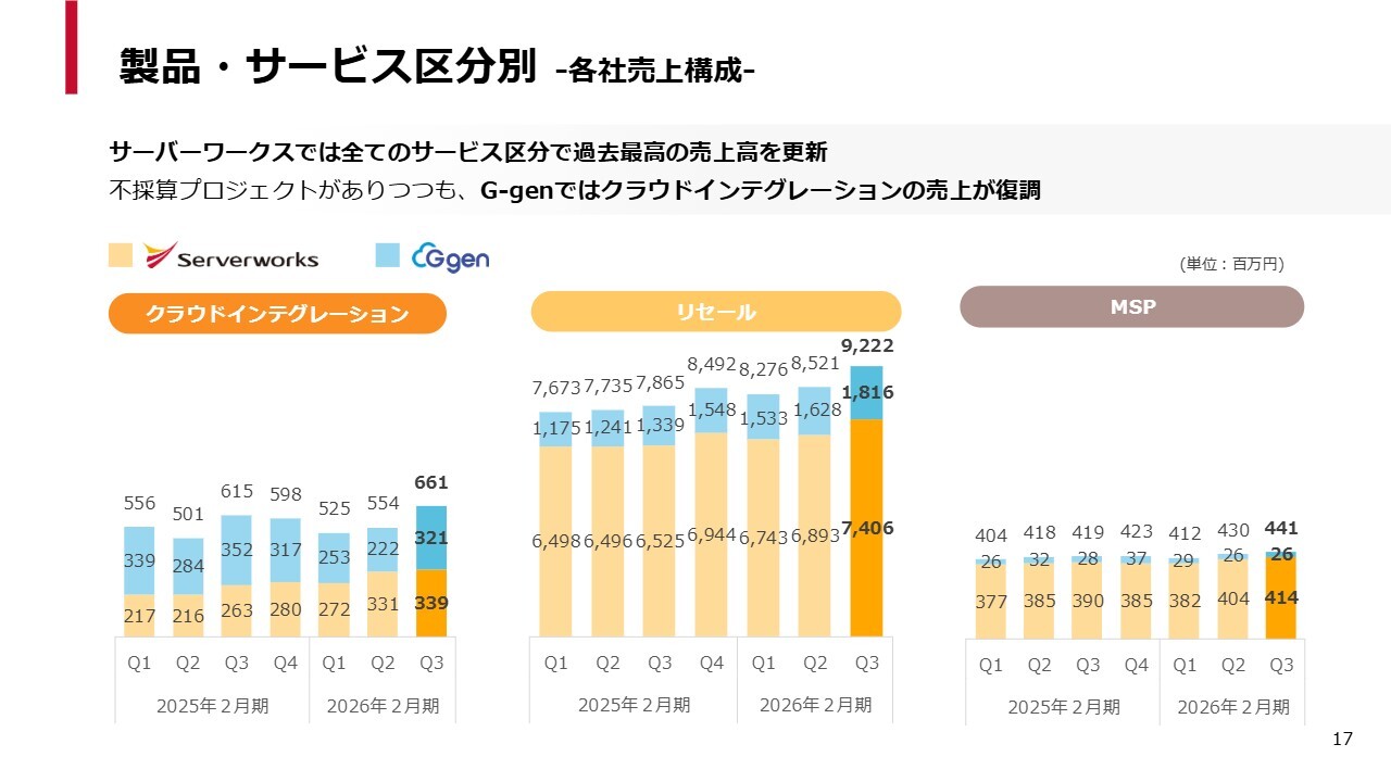 製品・サービス区分別の売上高です。クラウドインテグレーションは、両社ともに赤字プロジェクトの影響で、第1四半期と第2四半期は非常に苦しい状況が続きましたが、第3四半期には改善が見られました。