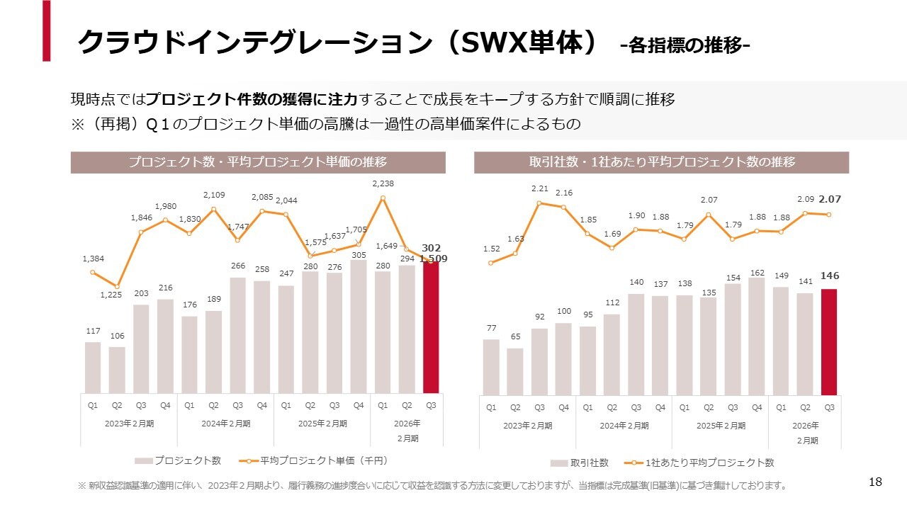クラウドインテグレーションを分解した、プロジェクト数と取引社数のメトリクスです。プロジェクトのため多少のばらつきがあるものの、プロジェクト数、取引社数ともに安定的に推移しています。