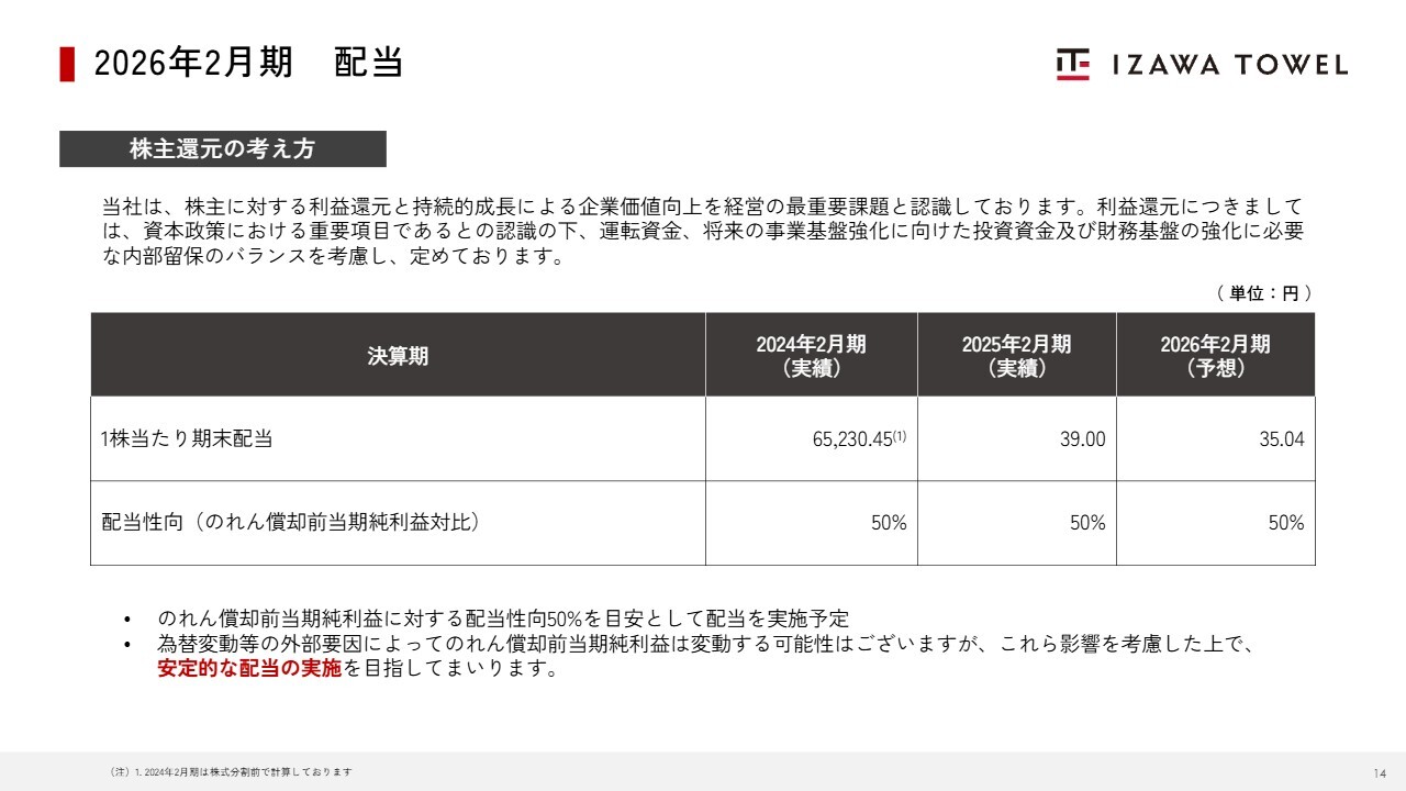 為替の変動によってのれん償却前当期純利益が大きく変動する可能性があるものの、前期実績を考慮し、また来期を見据え、安定的な配当の実施を目指していく方針です。