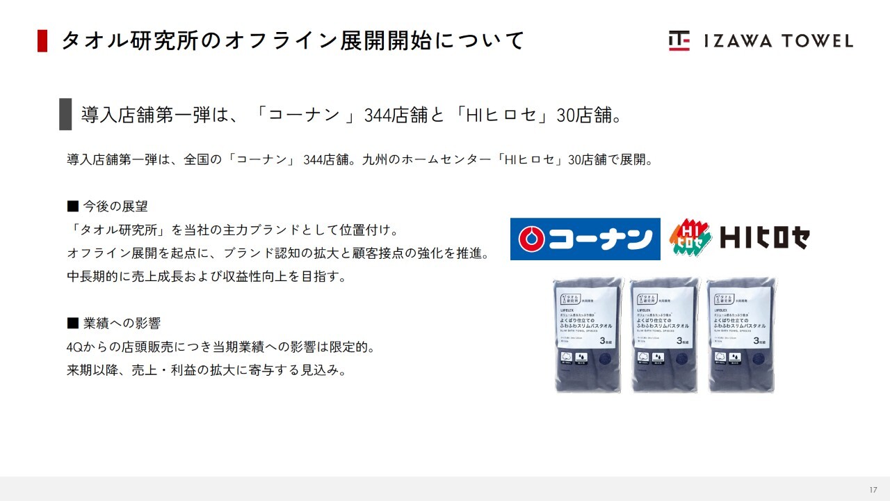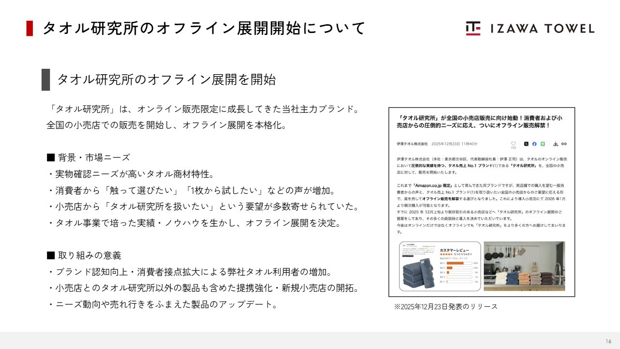 「タオル研究所」のオフライン発売展開についてです。昨年12月23日にリリースしたとおり、従来は「Amazon」のみの取り扱いでしたが、「実際にお店で触って買いたい」というお客さまの声にお応えし、本格始動しました。
