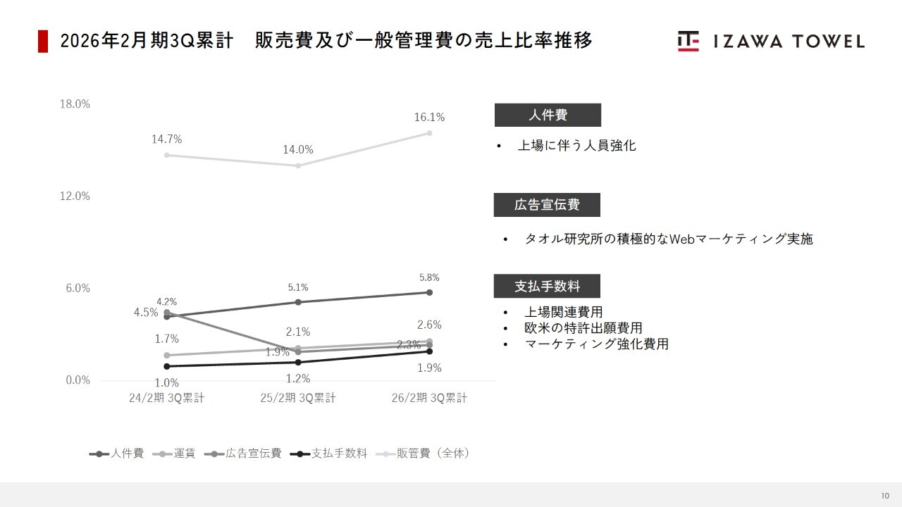 増加の要因は、上場関連費用の一時的な発生や「タオル研究所」の積極的なWebマーケティングの実施、欧米での特許出願費用の増加などによるものです。