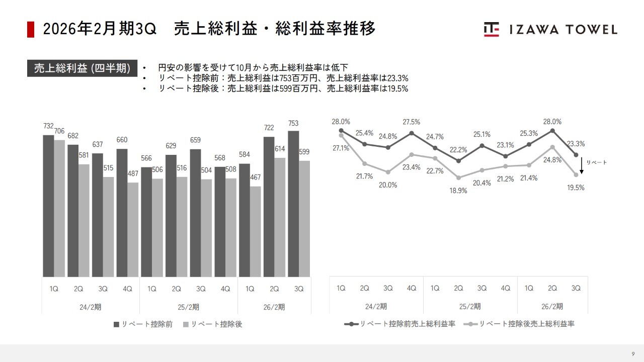 売上総利益および売上総利益率の推移です。リベート控除前の売上総利益は7億5,300万円、売上総利益率は23.3パーセントです。