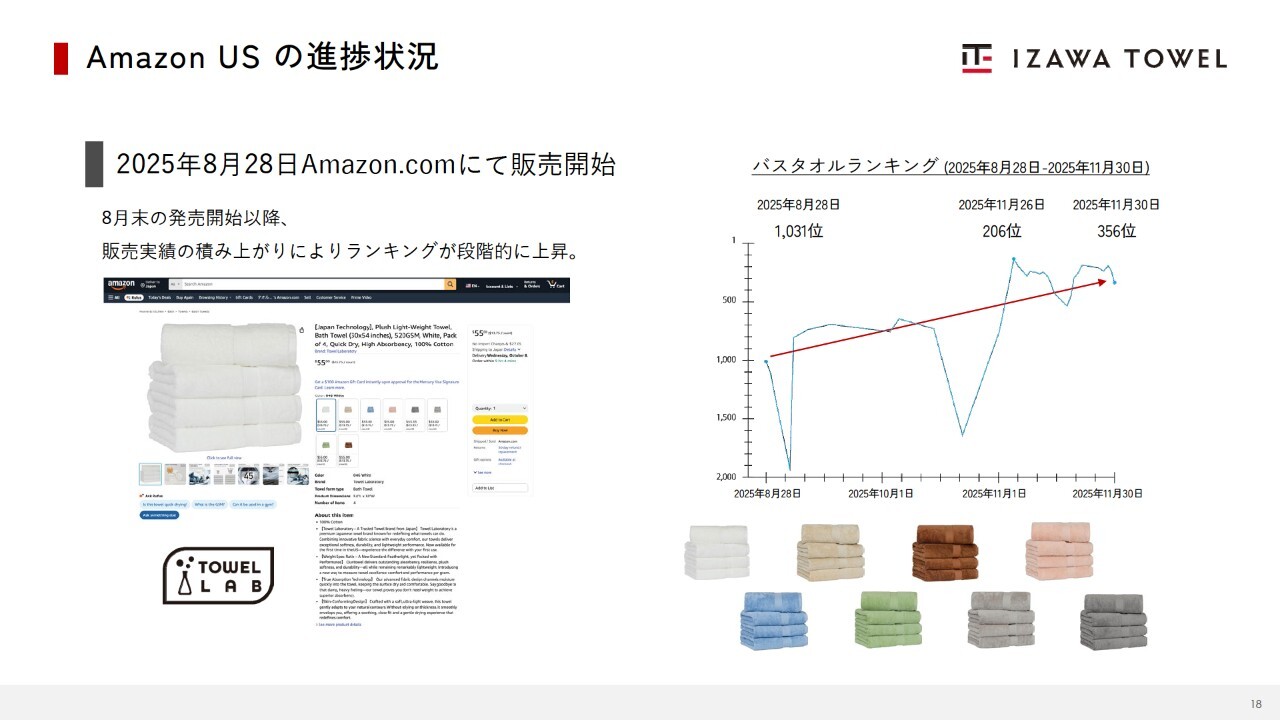 スライド右側のグラフは、昨年8月28日の発売開始から11月末までのバスタオルカテゴリにおけるランキング推移を示しています。発売開始直後は1,031位から始まりましたが、現地消費者からの評価が順調に積み上がり、11月末時点では356位まで上昇しました。瞬間的には206位を記録しています。