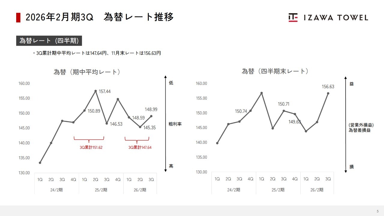 為替レートの推移です。当第3四半期累計期間の期中平均レートは147.64円と、前年同期より約3.98円の円高となっています。一方で、四半期末レートは156.63円と、期首に比べて7円円安に進んでいます。