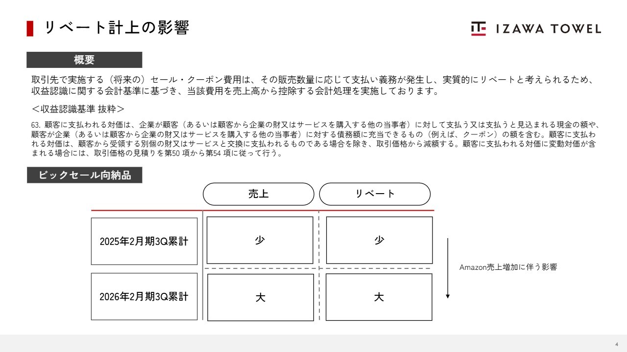 リベート計上の影響についてです。取引先で実施するセールやクーポン費用は、その販売数量に応じて支払義務が発生し、実質的にリベートと考えられます。そのため、収益認識に関する会計基準に基づき、当該費用を売上高から控除する会計処理を実施しています。