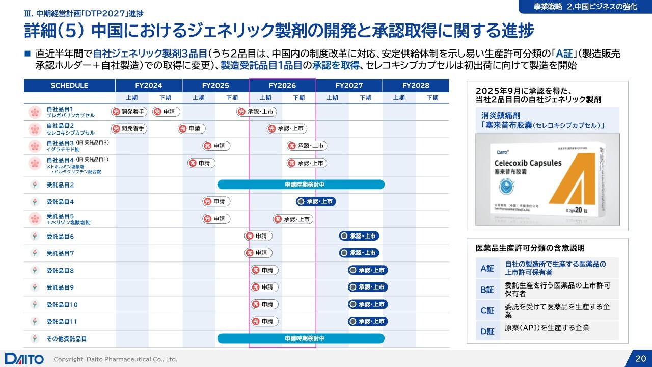 中国については、2品目の承認を取得したことを、本年1月6日と9日にプレスリリースで発表しました。それらも含めて、前回の2025年7月の通期決算説明以降、3品目の製造販売承認と1品目の製造受託品目の承認を取得しています。