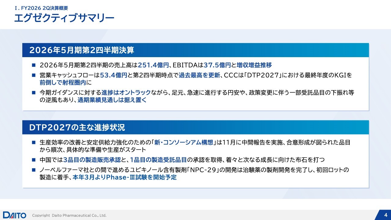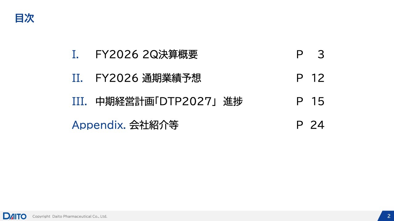 本日は、まず第2四半期の決算概要について、次に今期の通期業績予想について、ご説明します。こちらはCFOの大津賀よりご説明します。その後、中期経営計画「DTP2027」の進捗について、私からお話しします。