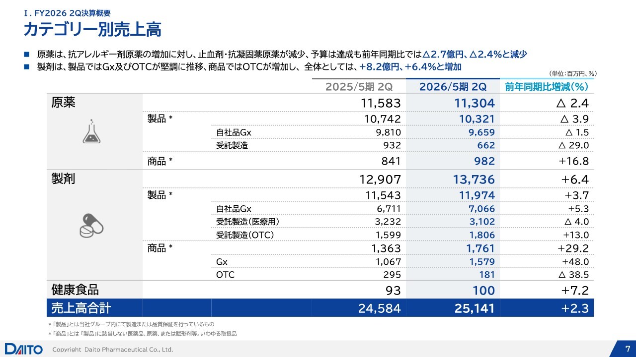 カテゴリー別売上高についてです。原薬に関しては、抗アレルギー剤向けの原薬が好調に推移した一方で、止血剤・抗凝固薬原薬では減収となりました。製剤については、ジェネリックおよびOTCが堅調に推移し、全体として増収となりました。