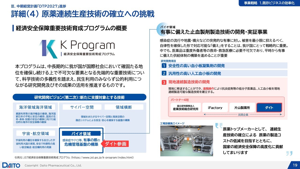 今後は製剤の連続生産への展開も見込まれますが、現時点では原薬の連続生産を中心に取り組んでおり、iFactory、片山製薬所、ダイトが参画した4社のパートナーシップでK Programに応募し、採択されています。
