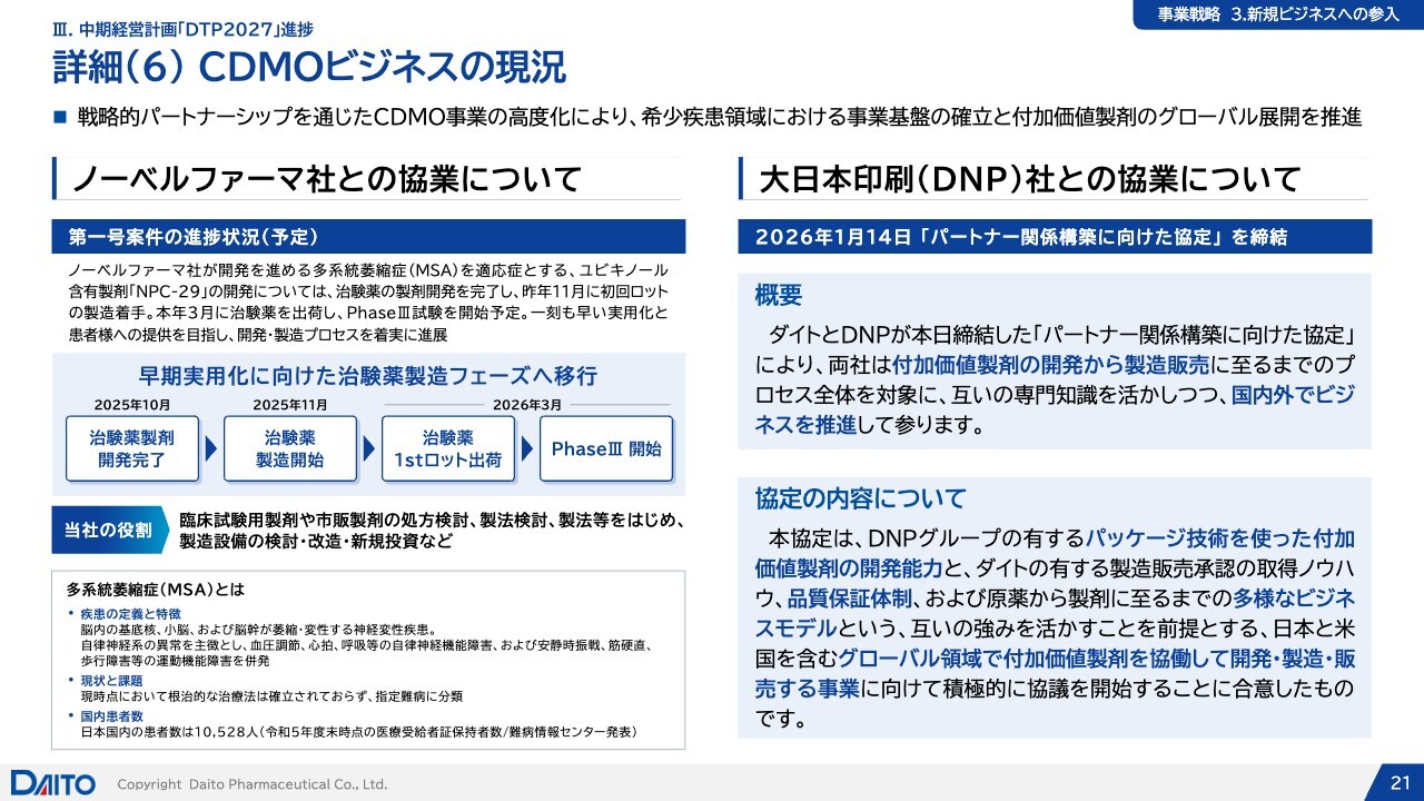 3番目の柱である、中長期の成長を目指した新規ビジネスへの参入に関連して、CDMOビジネスの現況についてお話しします。先ほどCFOからもお話があったノーベルファーマ社とのアライアンスの中で、第1号案件となる多系統萎縮症(MSA)に対するユビキノール含有製剤「NPC-29」を開発しました。