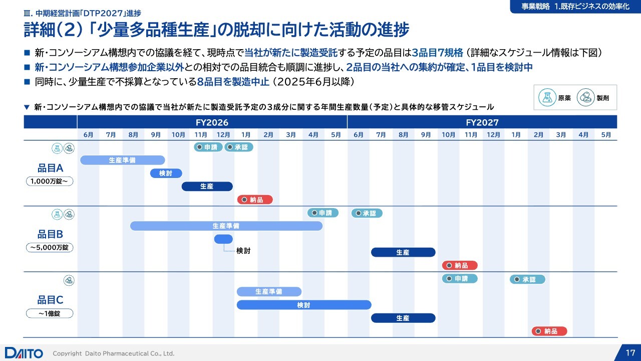 スライドに示した「ABC」の3つの事例は、新・コンソーシアム構想内での協議を経て、現時点で当社が新たに製造を受託する3品目7規格です。品目Aは今期に販売が始まりますが、品目Bと品目Cについては来期からです。図の赤印の「納品」のタイミングで初めて売上が計上されるかたちです。
