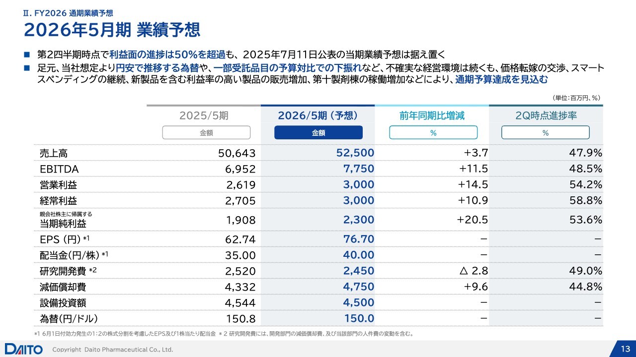 2026年5月期通期の業績予想です。先ほどのご説明のとおり、第2四半期時点では利益面の進捗率が50パーセントを超えていますが、足元の円安の進行や、一部受託品目が予算対比で弱含んでいる状況があります。