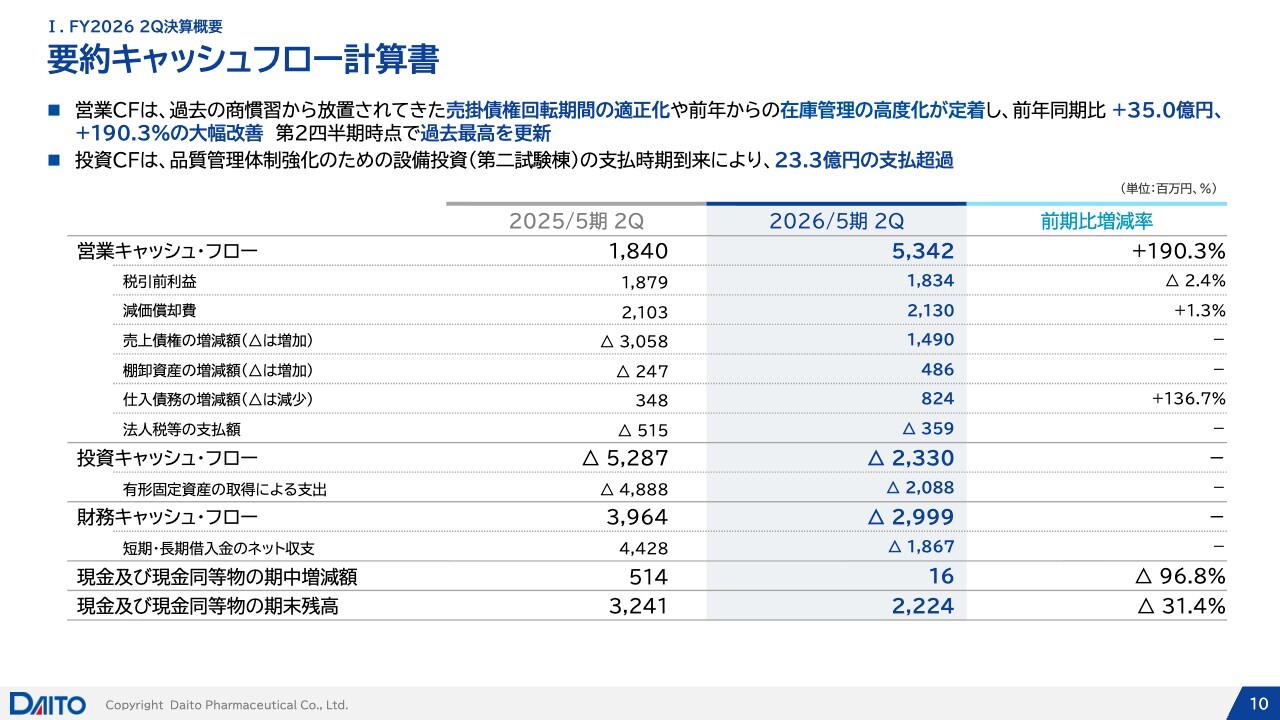 営業キャッシュ・フローは、第2四半期時点で過去最高を更新しました。こちらは、債権回転期間の短縮や在庫管理の高度化といった施策の効果が徐々に現れてきたものと考えています。