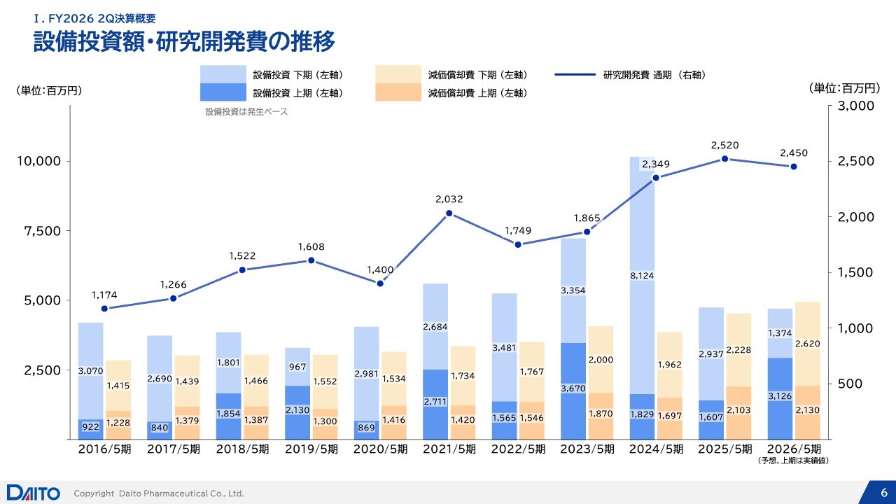 質問者:スライドの6ページのグラフを見ると、御社の設備投資は通常、下期偏重になることが多いようですが、今期は上期のほうがかなりウエートが高くなっています。この要因について教えてください。