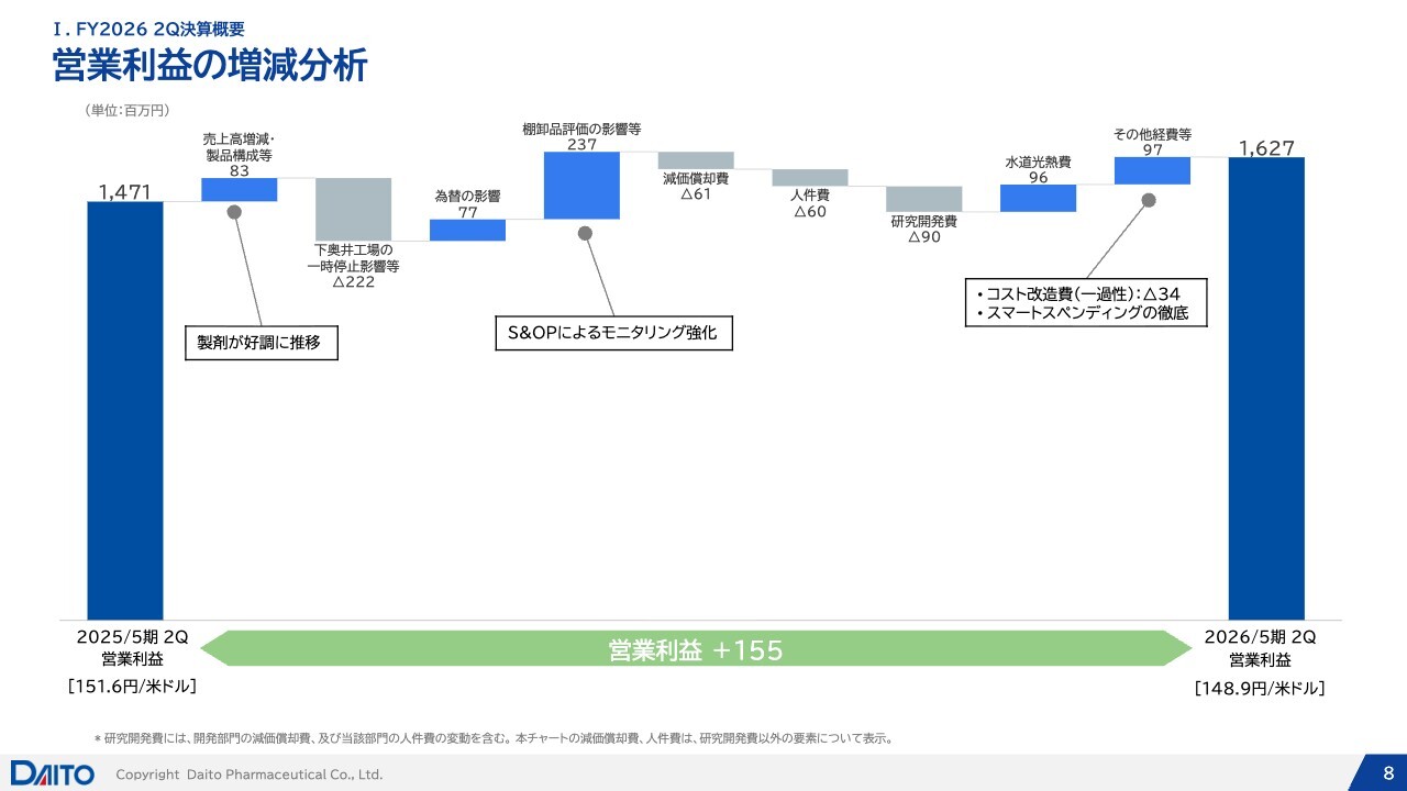 ウォーターフォールチャートによる、営業利益の増減分析です。今回は約1億5,000万円の増益となった要因を分析しました。トップラインの伸長および製剤の比率が高まったことが、増益に貢献しています。